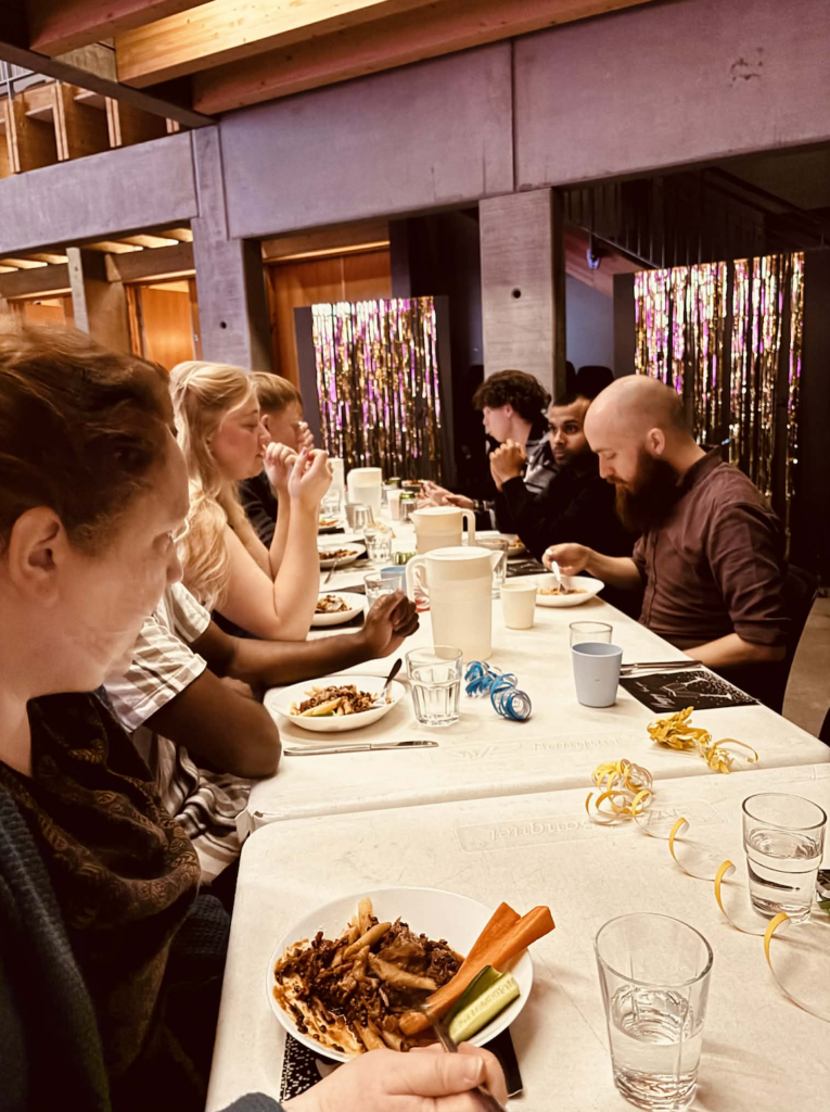 Du træder ind ad døren til din kirke og ser en håndfuld venner, der allerede står og snakker ved baren, mens der åbnes en sodavand og en øl. I sofaen sidder nogle og griner. Fra køkkenet breder duften af varme krydderier sig – kikærtegryden står og simrer. Du hører stoleben ramme hinanden, mens stolene i kirkesalen bliver stablet, og får øje på nogle, der er ved at sætte borde op til spisningen.